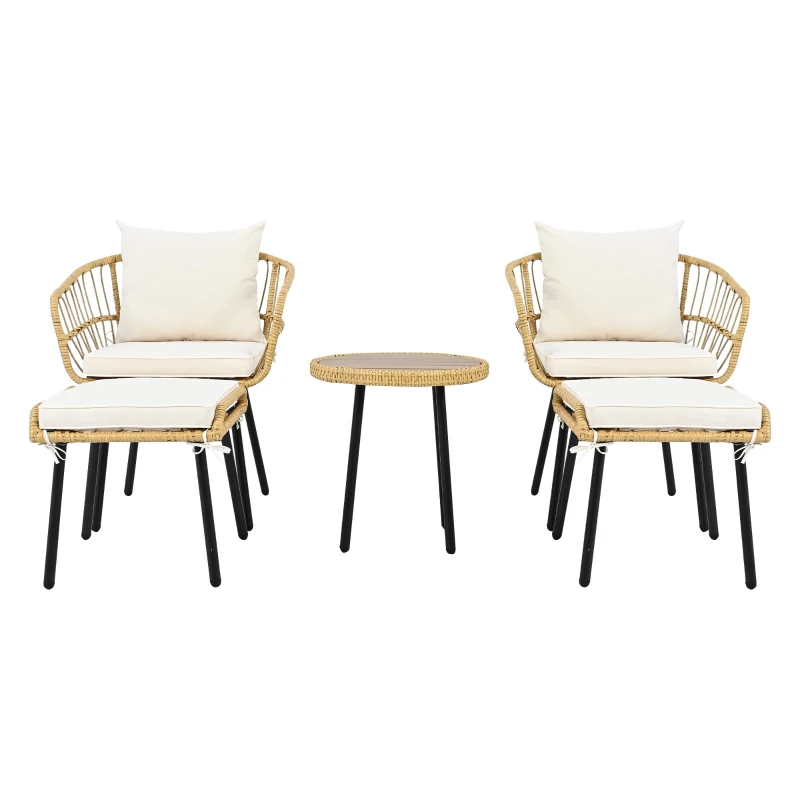 5-teiliges Garten-Lounge-Set, mit 1 Esstisch, 2 Stühlen, 2 Hockern, Weiß+Naturfarbe
