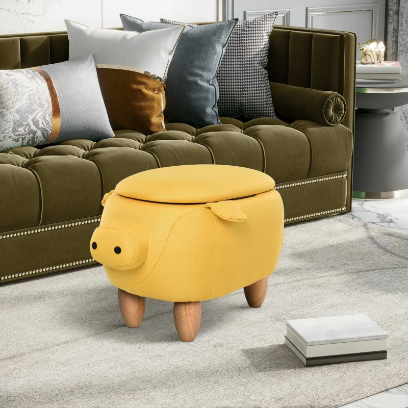 HOMCOM Tierhocker, Dekohocker mit Stauraum, Polsterhocker, Sitzhocker, Truhenbank, Fußbank, Fußhocker, Sitzbank mit Tier-Design, für Wohnzimmer, Schweinchen Fußbank, Gelb, 62 x 35 x 36 cm