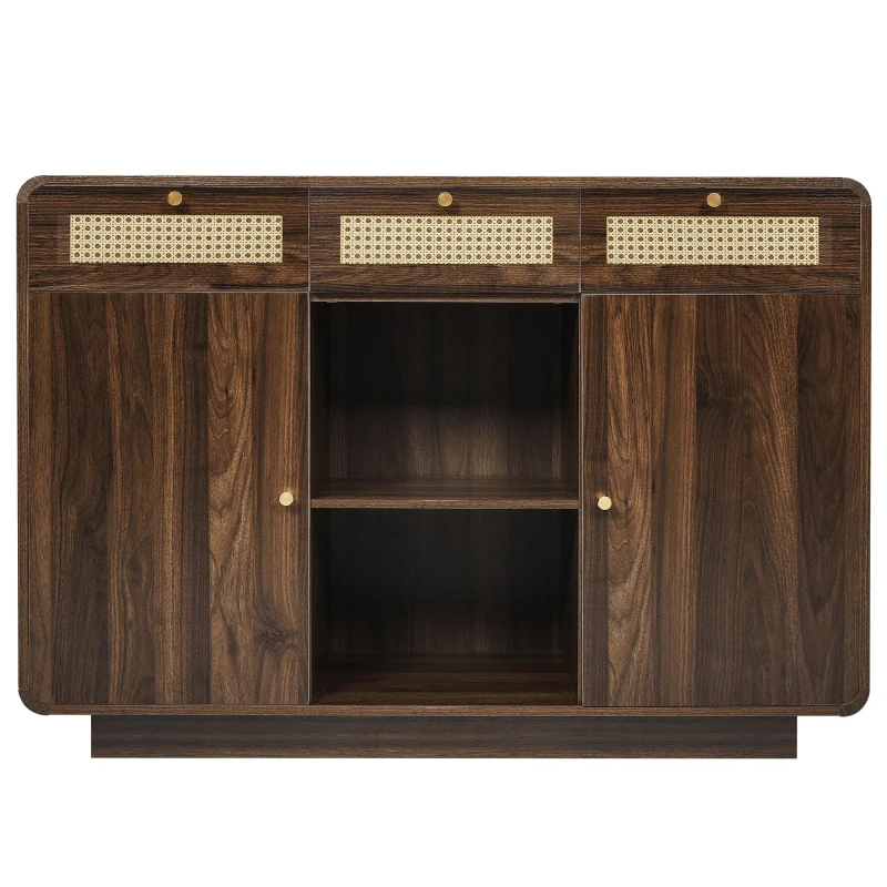 Kommode, 3 Schubladen + 2 Schränke mit offenem Mittelregal und Rattan-Fronten, 120 x 40 x 85 cm, Braun