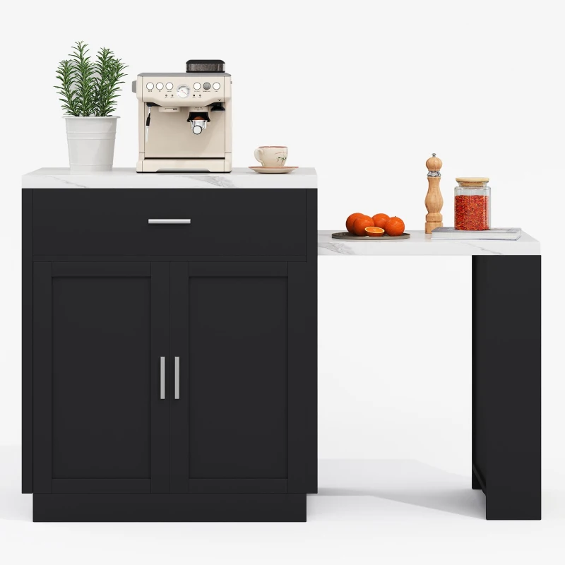 Kücheninsel mit ausziehbarem Esstisch, Aufbewahrungsschrank, 2 Schubladen, 2 seitlich offene Regale, 211x55x89,5 cm, Schwarz