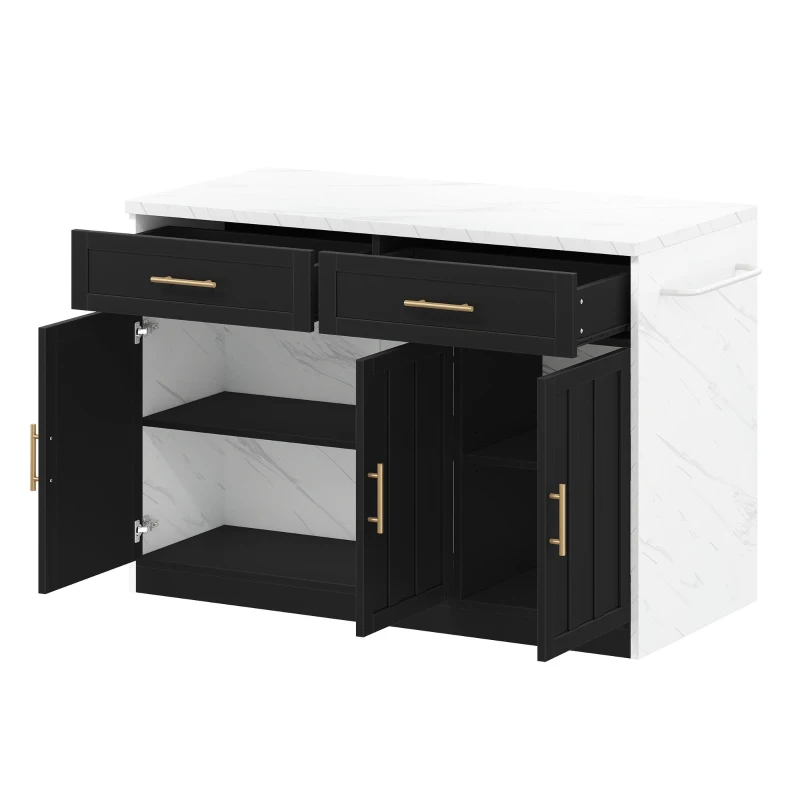 Kücheninsel mit Bartheke, mit 2 Schubladen und 3 Türen, Metallgriffe, Handtuchhalter, 120x60x91 cm, Schwarz