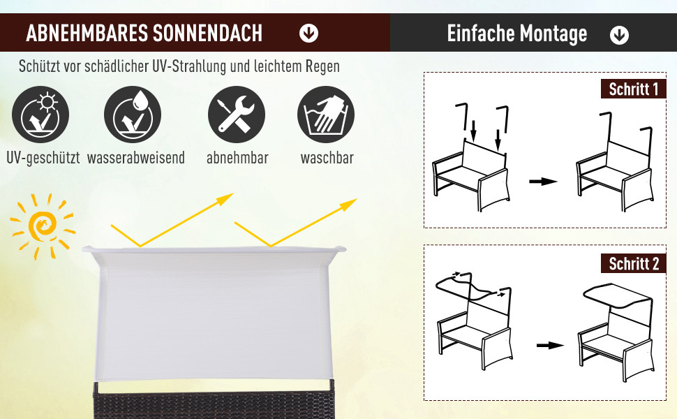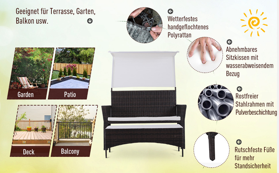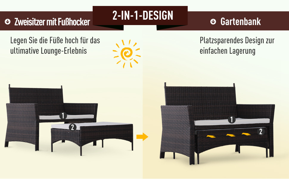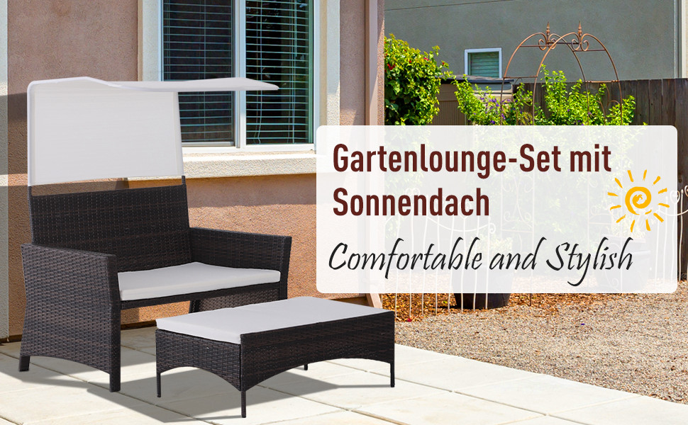Outsunny® 2-tlg. Gartensofa Gartenmöbel Lounge Gartenset Rattanmöbel Braun Polyrattan 1 x Hocker mit Sonnendach