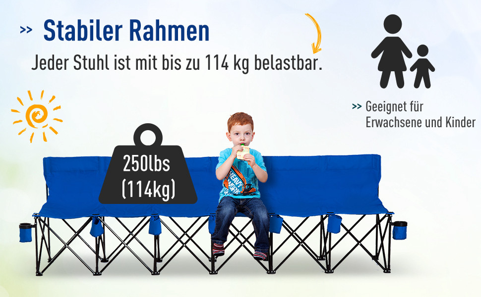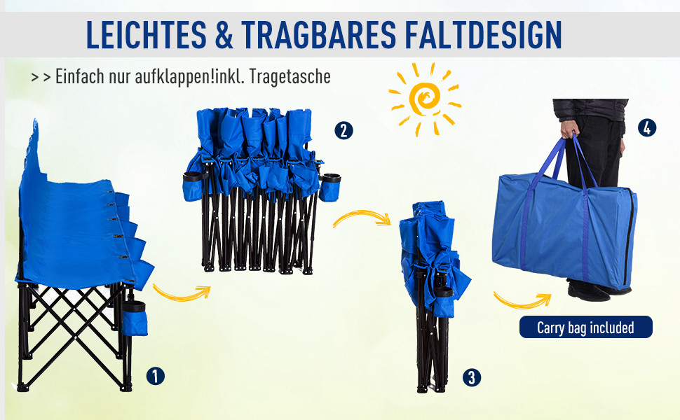 Outsunny Campingbank Faltbank Gartenbank Klappbank Bank Camping 6-Sitzer mit Tragetasche, Oxford+Metall, Schwarz/Blau, 259x48x80cm (Blau)