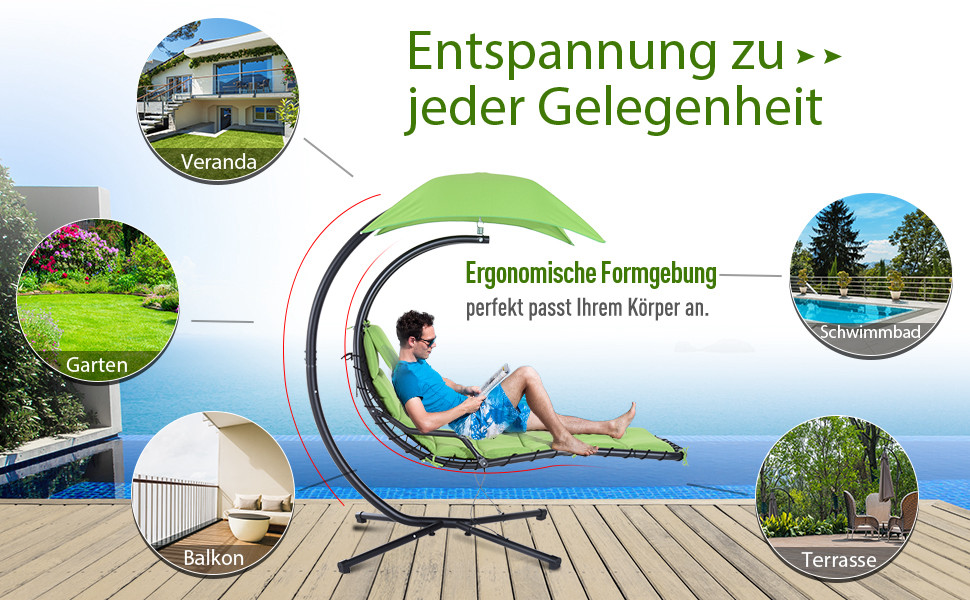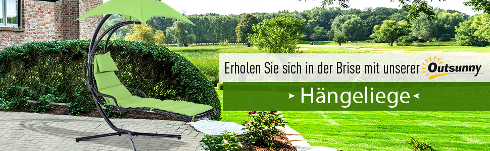 Outsunny Hängeliege mit Sonnendach, Hängesessel mit Kopfkissen, Hängeschaukel, Schwingliege, Metall Polyester, Grün, 190 x 115 x 190 cm