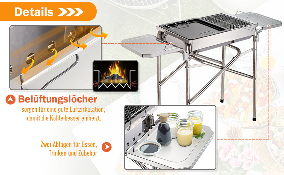 Outsunny Holzkohlegrill Grill BBQ Standgrill Holzkohle Kohlegrill Gartengrill, Edelstahl, Silber, 104 x 30 x 68 cm