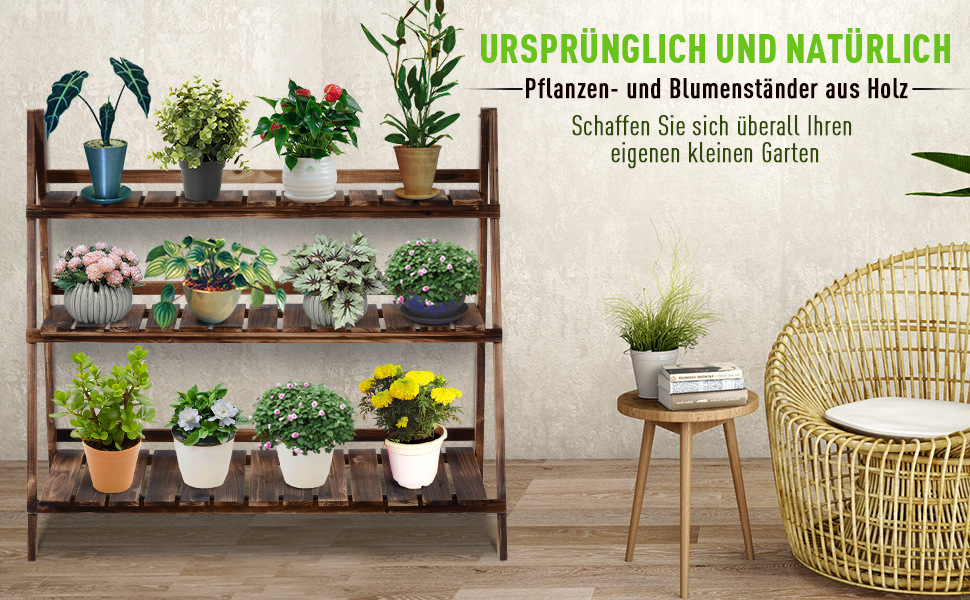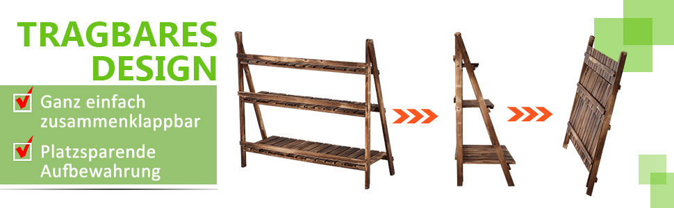 Outsunny 3-Etagen Pflanzenständer, klappbarer 93 cm hoch Blumenständer für Innen Außen, Pflanzenregal aus Holz, Blumentopfständer mit Tabletts, Blumentreppe für Wohnzimmer, Garten Balkon, Dunkelbraun