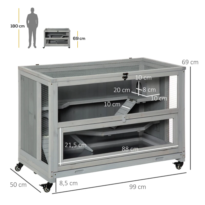 PawHut Kleintierkäfig auf 2 Ebenen mit Leitern u. Höhlen 99 cm x 50 cm x 69 cm Tannenholz Metall Glas Hellgrau