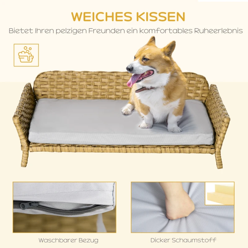 PawHut Rattan Hundesofa Hundekorb Hundebett mit Kissen Katzenbett Katzensofa Geflochtenes Haustiersofa für kleine und mittelgroße Hunde erhöhtes Design wetterbeständig Gelb 84 x 53 x 25 cm