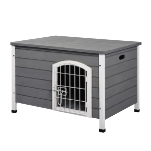 PawHut Hundehütte aus Massivholz, mit 2 Fressnäpfen, Veranda, wetterbeständig, 103 cm x 62 cm x 66 cm, Grau + Weiß