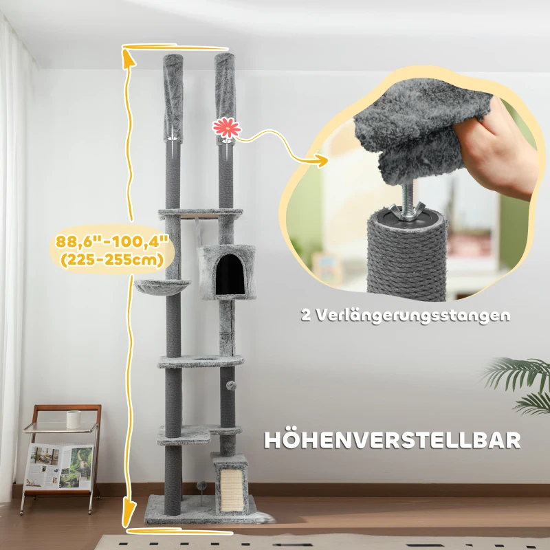 PawHut Kratzbaum, 4 Etagen, deckenhoch, verstellbar 225-255 cm, Hängematte, Haus, Grau
