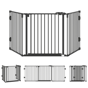 PawHut Absperrgitter Hund 4-teilig, 204 x 75 cm Faltbar Türschutzgitter mit Tür, Freistehend Hundegitter mit 2 Stützfüßen, Treppengitter aus Holz für Flur, Küche, Treppe, Weiß