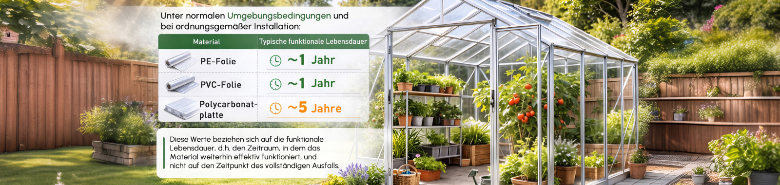 Gewächshausmaterialien, UV-Degradation, Polyethylen-Folie, Polycarbonat-Platten, Materiallebensdauer, Gewächshauswartung